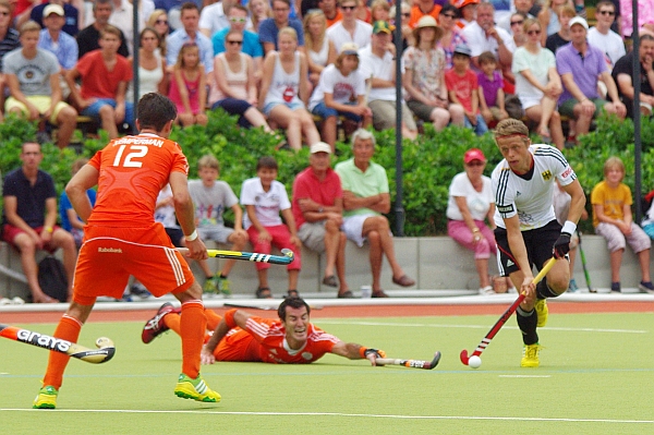 28.07.2013 - Die deutschen Hockey-Herren sicherten sich in letzter Sekunde mit einem 2:2 (0:1) gegen Holland den Turniersieg beim ERGO Masters Vier-Nationen-Turnier in Hamburg. 25 Sekunden vor Schluss sorgte Christopher Rühr mit seinem umjubelten Tor für den späten Ausgleich. Aufgrund des um zwei Treffer besseren Torverhältnisses konnte Deutschland somit die Tabellenführung erfolgreich verteidigen. Besonders in der ersten Hälfte tat sich die DHB-Auswahl jedoch sehr schwer.
