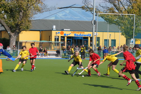 06.10.2008 - Wie normalerweise in jedem Jahr wurde auch zum Abschluss der diesjährigen Feldsaison der Saale-Pokal für die Knaben B in Köthen ausgespielt. Der Pokal für die Mädchen B musste leider mangels Meldungen ausfallen. Auch bei den Knaben B war es im Vorfeld schwierig, eine komplette Runde auszuspielen. Leider sagten sowohl Mecklenburg-Vorpommern als auch Thüringen ab. Für Sachsen Anhalt startete die Mannschaft des Cöthener HC, für Sachsen traten die beiden Mannschaften von Leipziger SC und von ESV Dresden an. Aus Berlin machte sich TuS Lichterfelde (als 3. der Berliner Meisterschaften) auf den Weg.